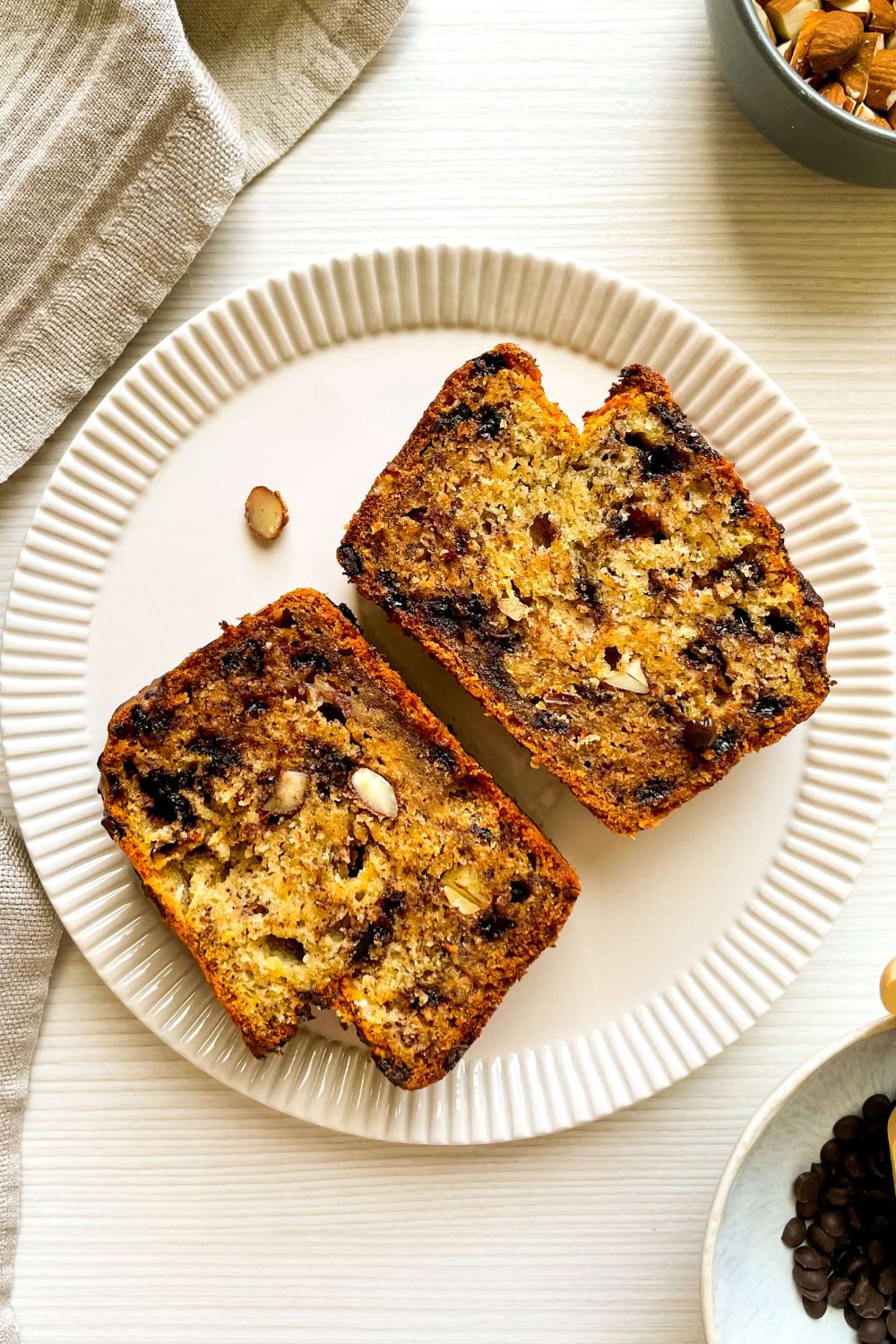 Almonds and chocolate chips perfectly complement sweet ripe bananas creating a wonderfully moist banana bread. It is perfect for breakfast, dessert, or as a mid-day reward.