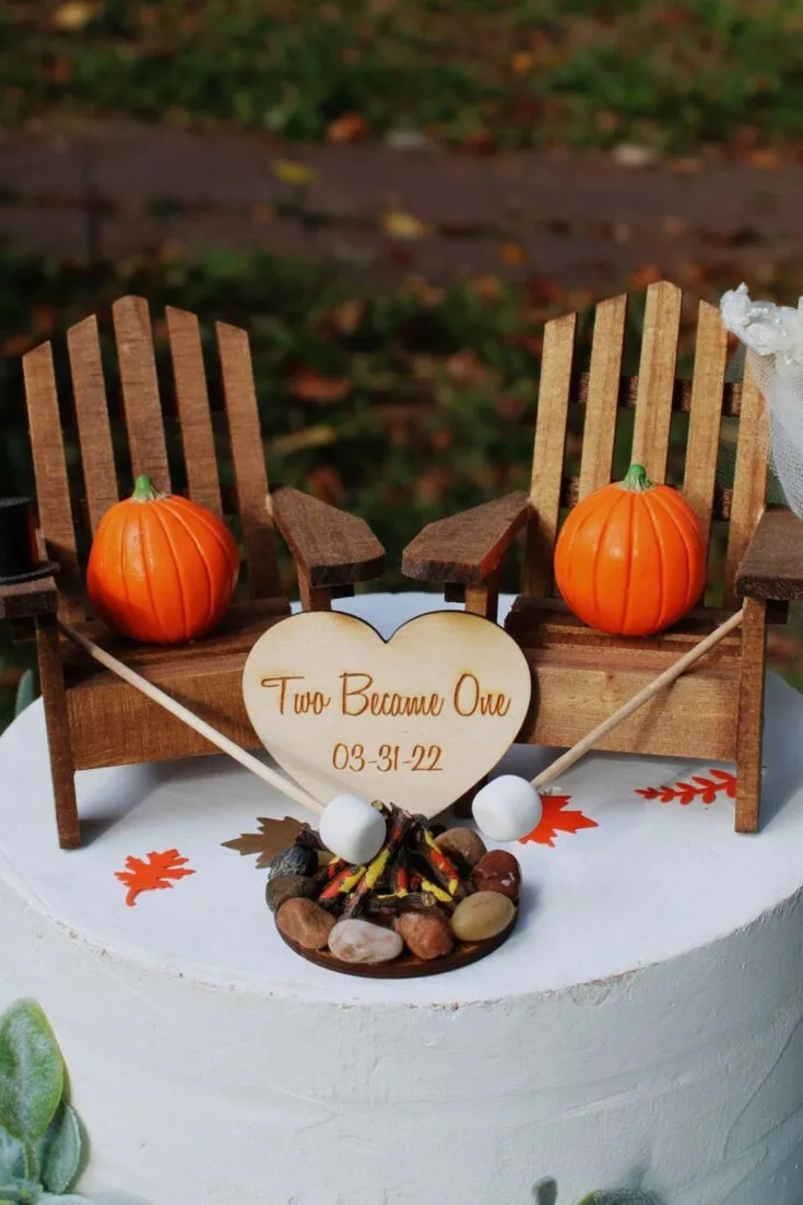 This rustic fall cake topper includes pumpkins, marshmallows, a firepit, and a custom heart—perfect for cozy autumn weddings.