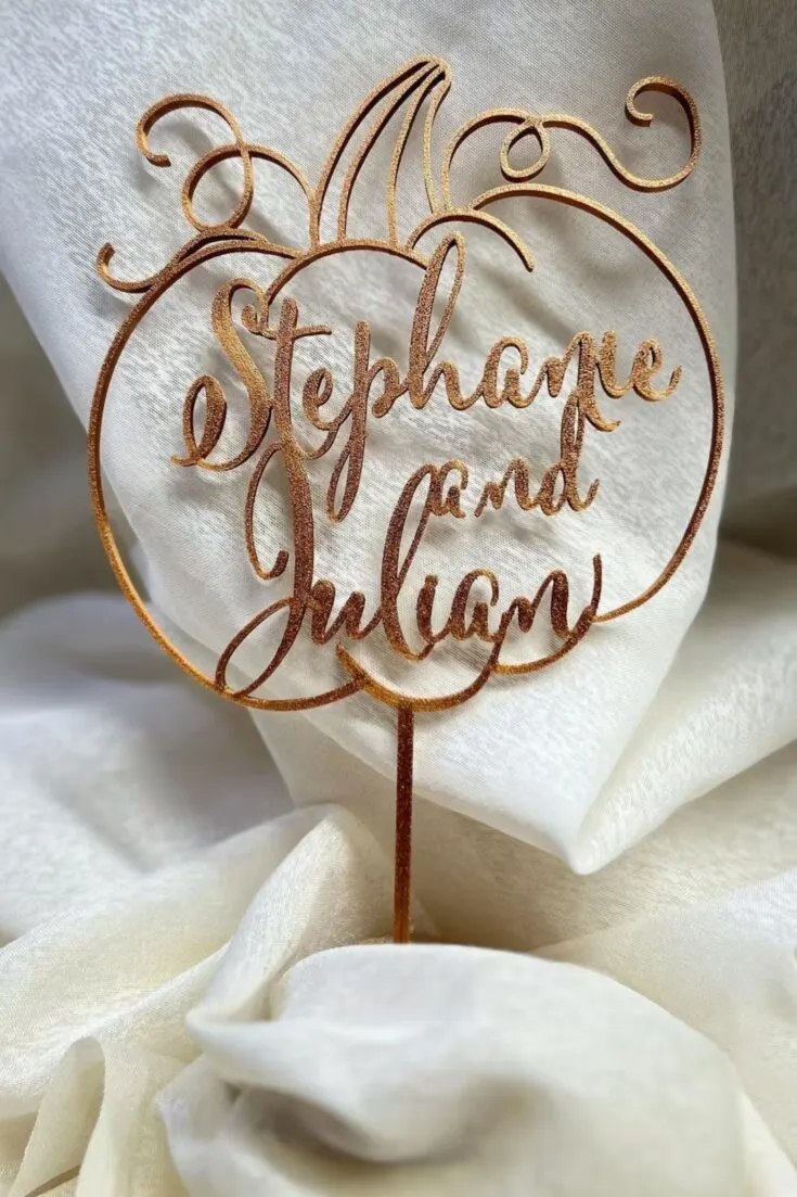 This 3D-printed pumpkin cake topper adds a rustic autumn touch to your big day. Personalise it with your names or a short message for a sweet and seasonal fall wedding cake.