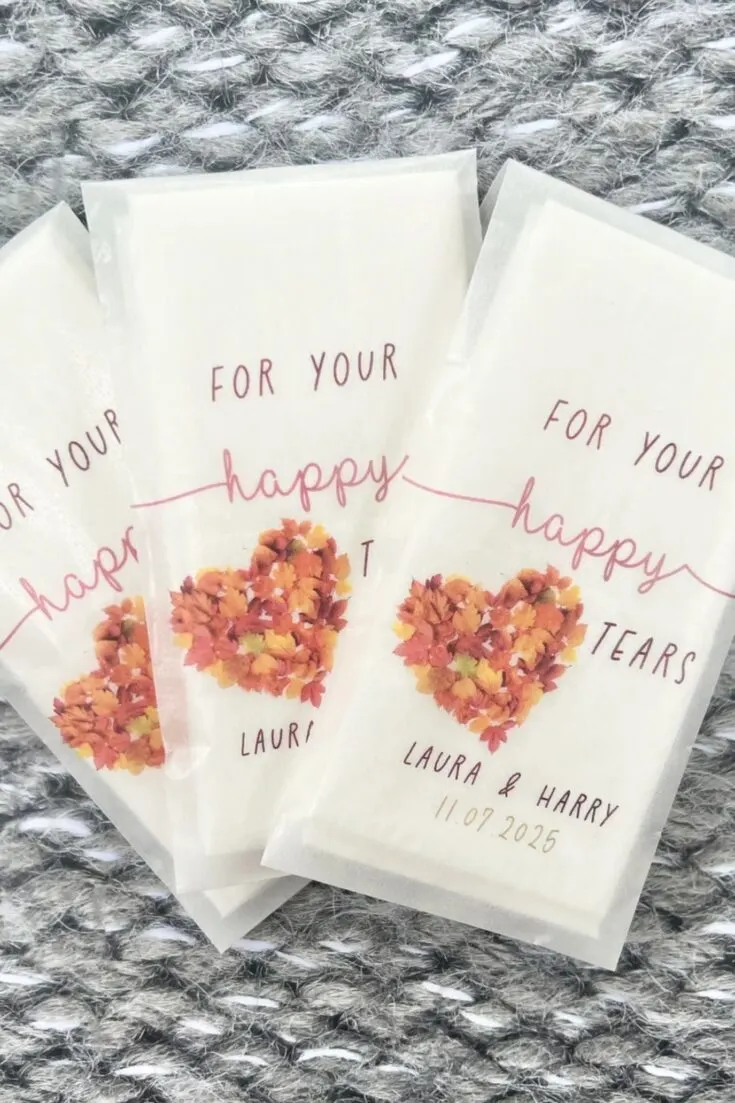 These personalised wedding tissues are perfect for guests at your ceremony. Each biodegradable pack includes three luxury tissues—sweet, elegant, and made for those emotional autumn wedding moments.