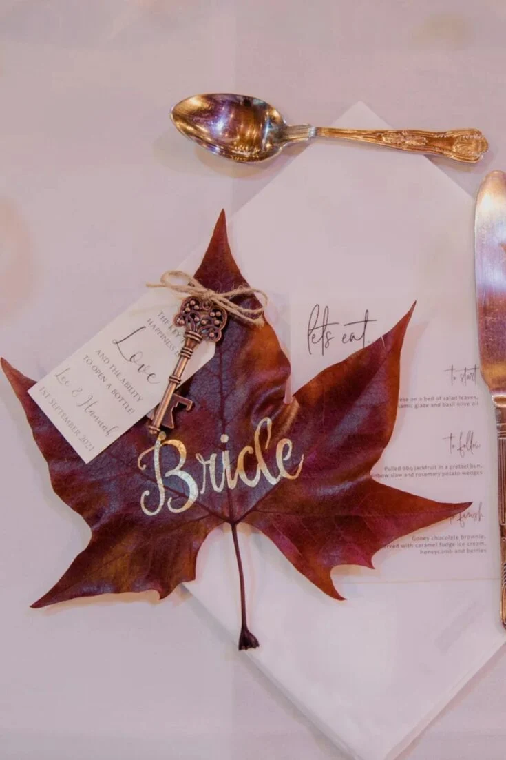 These preserved autumn leaves make stunning place cards and unique wedding favours. Handpicked in Sussex and painted with gold calligraphy, each one is completely natural and biodegradable—perfect for an eco-friendly autumn wedding.