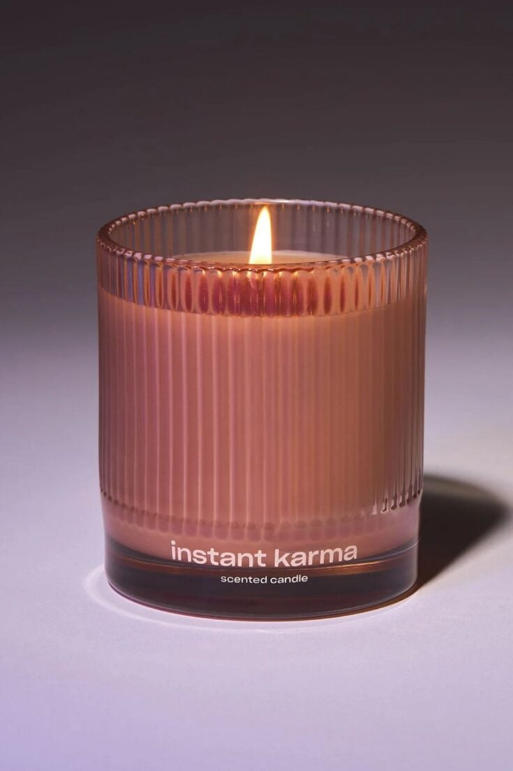 Warm cardamom, cinnamon, pear, and vetiver make the Instant Karma Candle a festive holiday scent. Perfect for cozy Christmas nights.