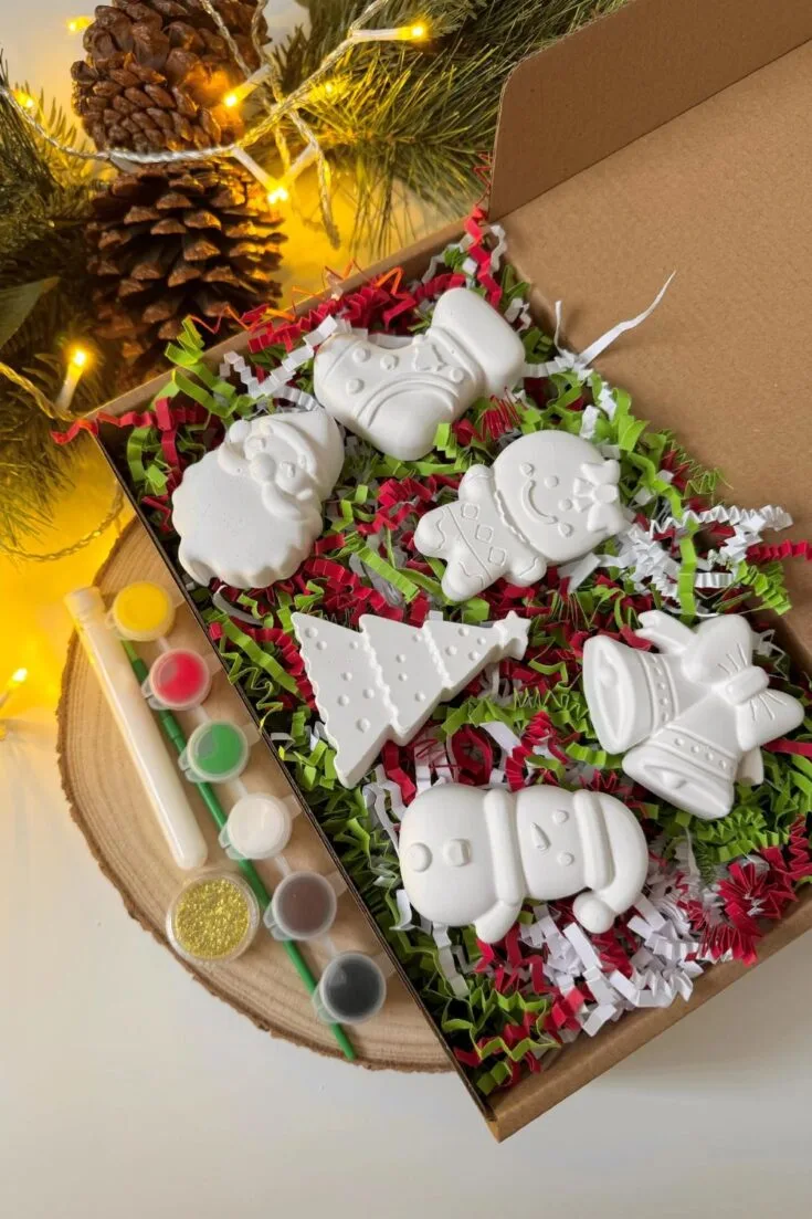 Kids paint small plaster Christmas figures using the paints, brush, glitter, and glue included. A simple craft for parties, stocking fillers, or Christmas Eve boxes.