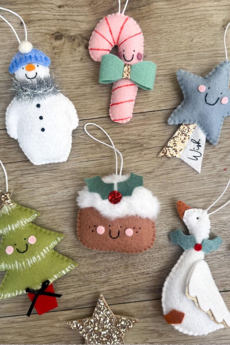 Soft felt ornaments shaped like stars, puddings, candy canes, trees, geese and snowmen. Each one is stitched by hand and finished with cute details. A simple way to add charm to any tree or garland.