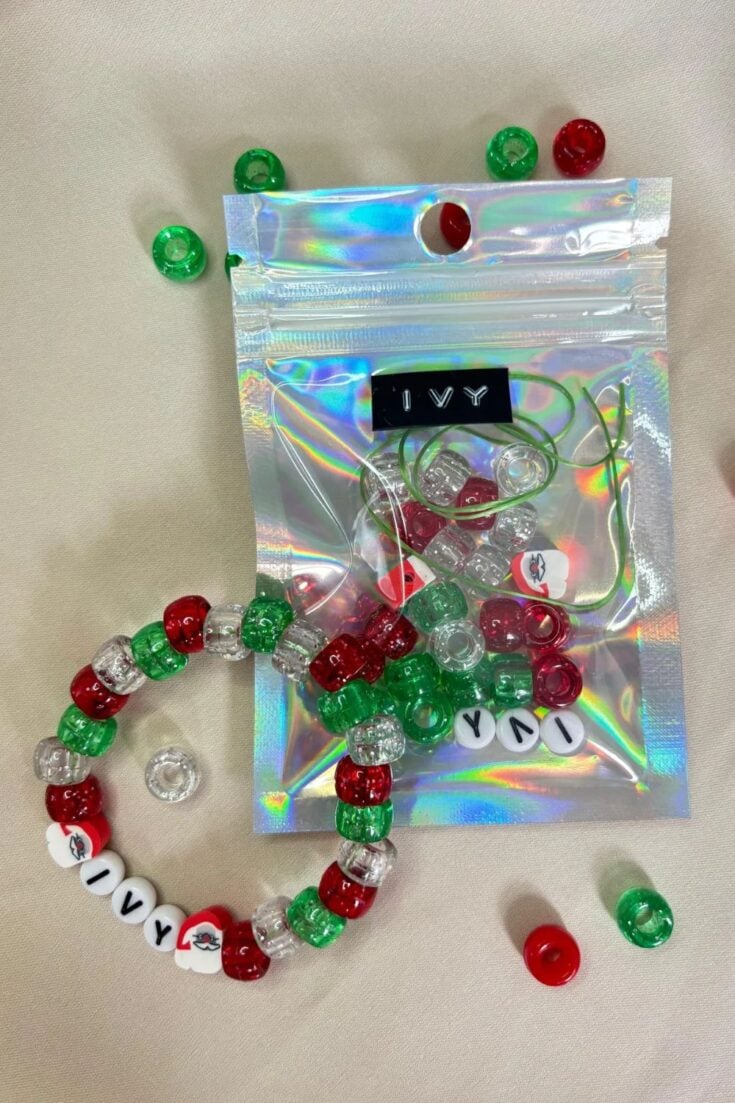 Kids make a festive beaded bracelet with their name and two Christmas charms. A simple personalised craft and a cute stocking filler.