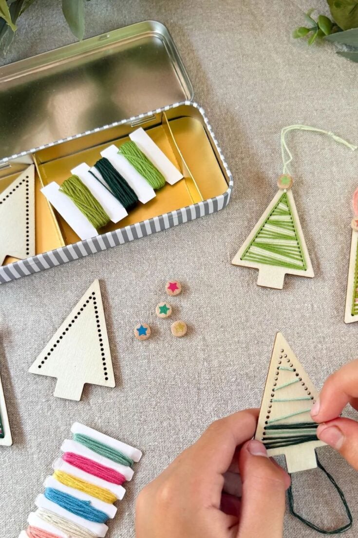 Kids stitch wooden Christmas tree ornaments using cotton thread and beads. A simple plastic-free craft that adds a handmade touch to the tree.