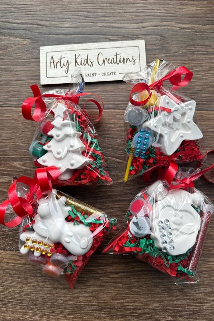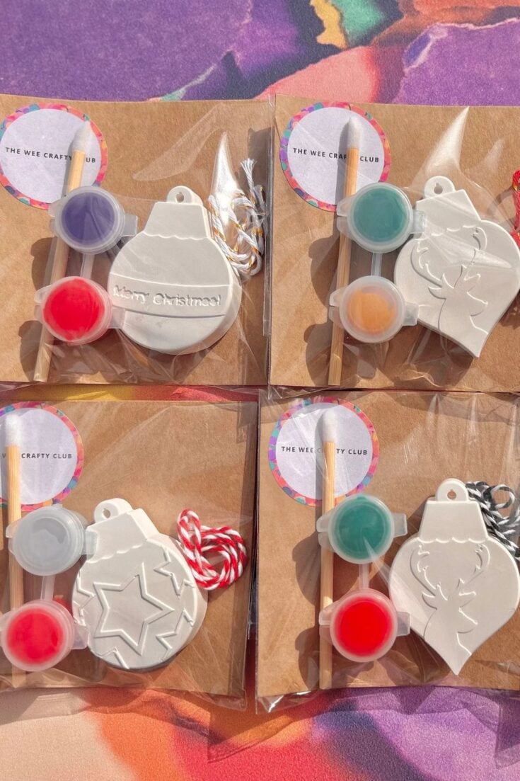 Each party bag has a Christmas plaster figure, paints, brush, glitter, and gems. Kids paint their own ornament. Great for stockings, party favours, or Christmas Eve boxes.