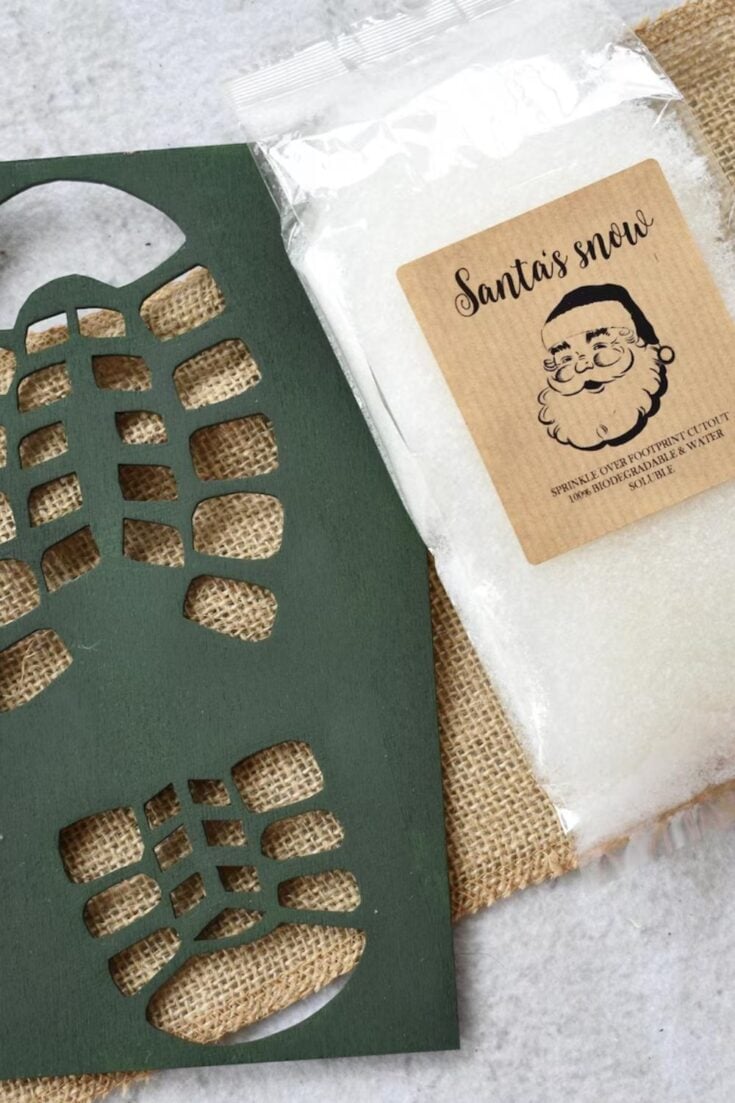 Create snowy Santa footprints using a wooden stencil and biodegradable Snowfetti. A simple Christmas Eve idea that adds a magical surprise for kids.