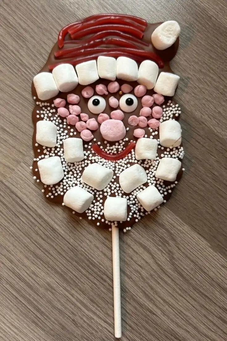 Kids melt chocolate, pour it over a Santa template, add sprinkles, and make their own festive lollipop. A fun Christmas craft and a cute stocking filler.