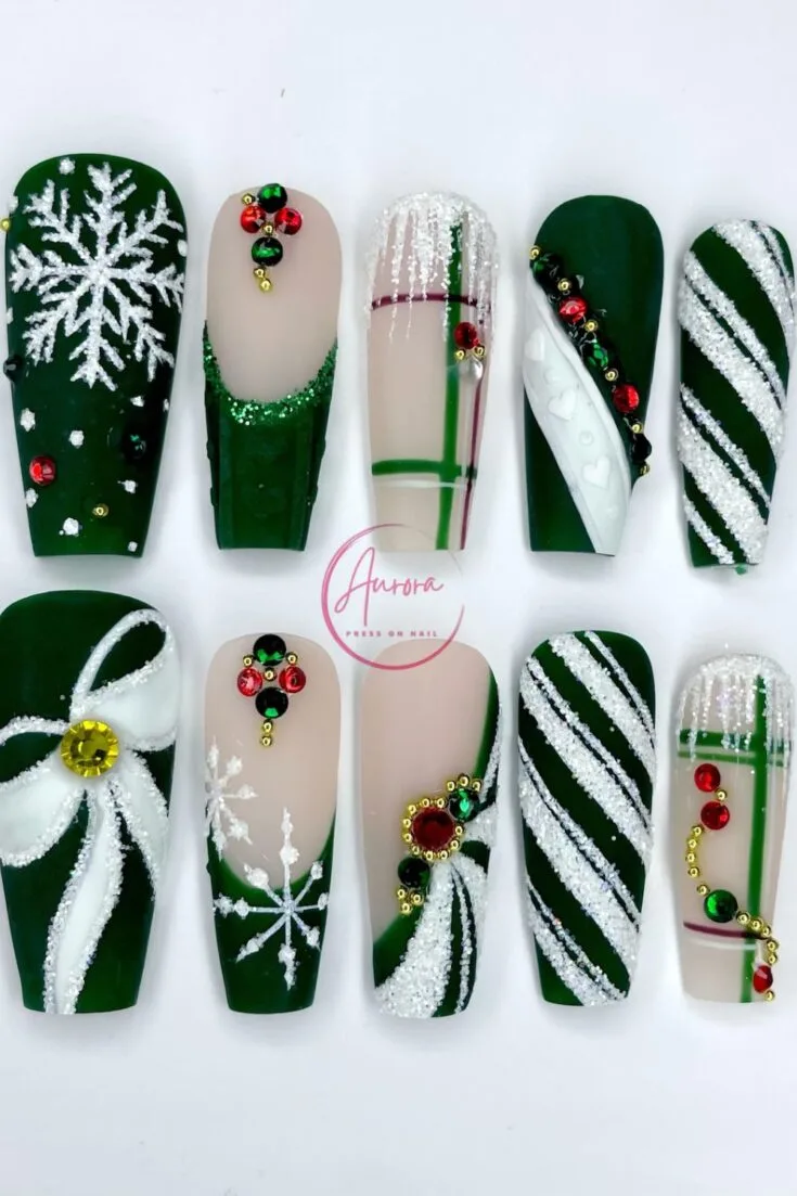 Green and nude press-ons with bold snowflakes, glitter stripes, bows, and festive gems. Bright, detailed, and perfect for holiday parties.