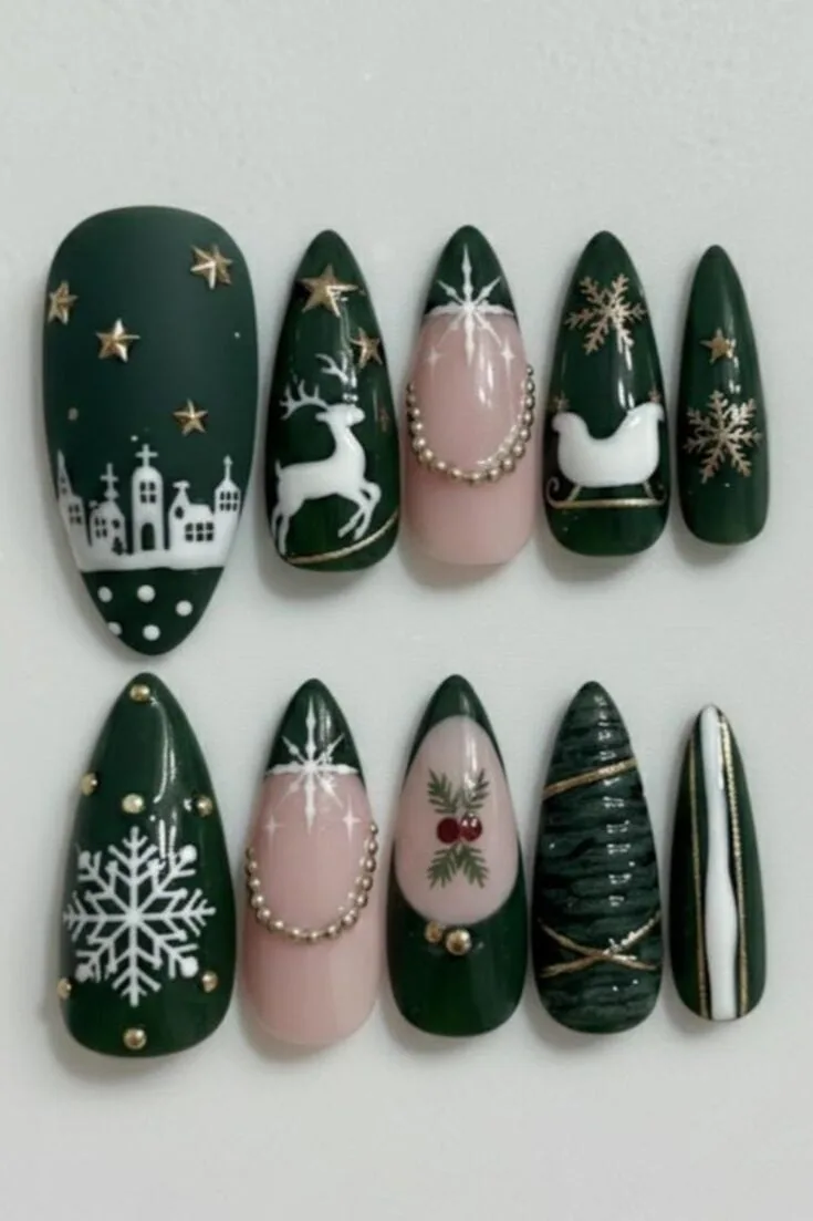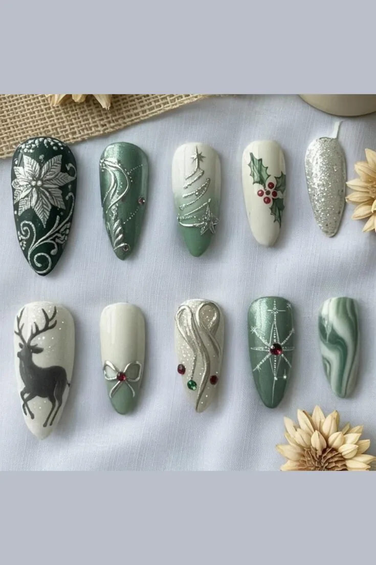 Green and white nails with silver Christmas trees, poinsettias, holly, reindeer, and glitter. Elegant, detailed, and perfect for a festive winter look.
