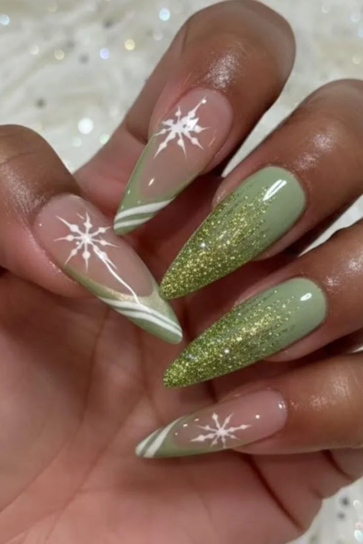 Soft green nails with white snowflakes, striped tips, and gold glitter accents. Fresh, simple, and perfect for a light festive look.