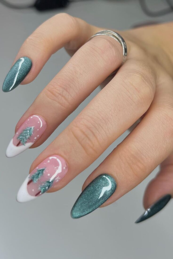 Shimmery green nails with soft neutral accents featuring tiny Christmas trees and crisp white tips. Simple, cute, and festive.