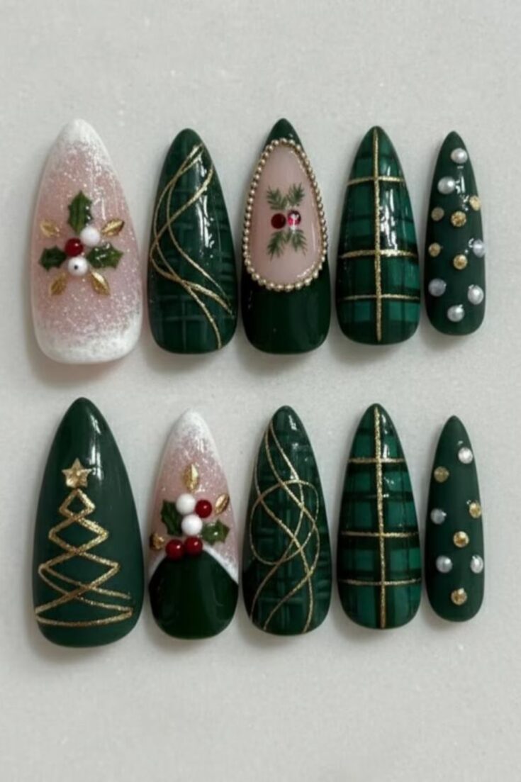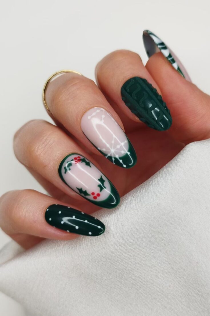 Deep green nails with holly accents, snowflake lines, and a cosy sweater-textured nail. Festive, simple, and perfect for winter.