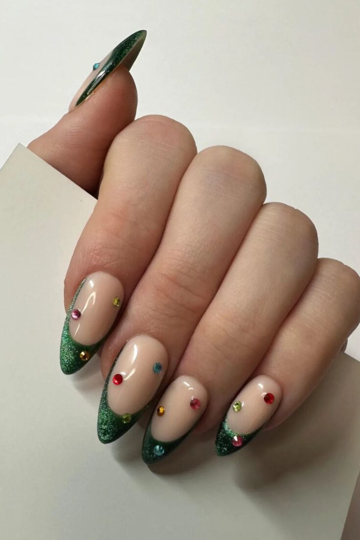 Green glitter French tips decorated with small colourful gems. Simple, bright, and perfect for a festive holiday look.