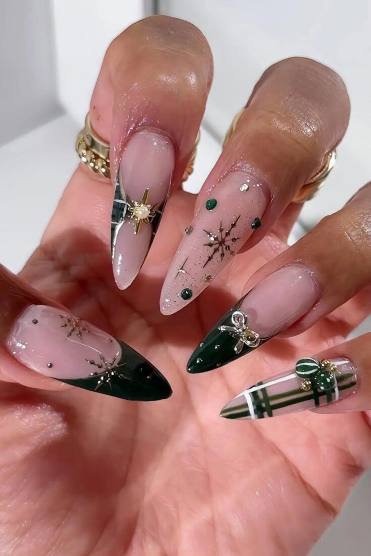 Deep green nails with plaid accents, snowflakes, and metallic bow and star charms. Festive, elegant, and full of detail.