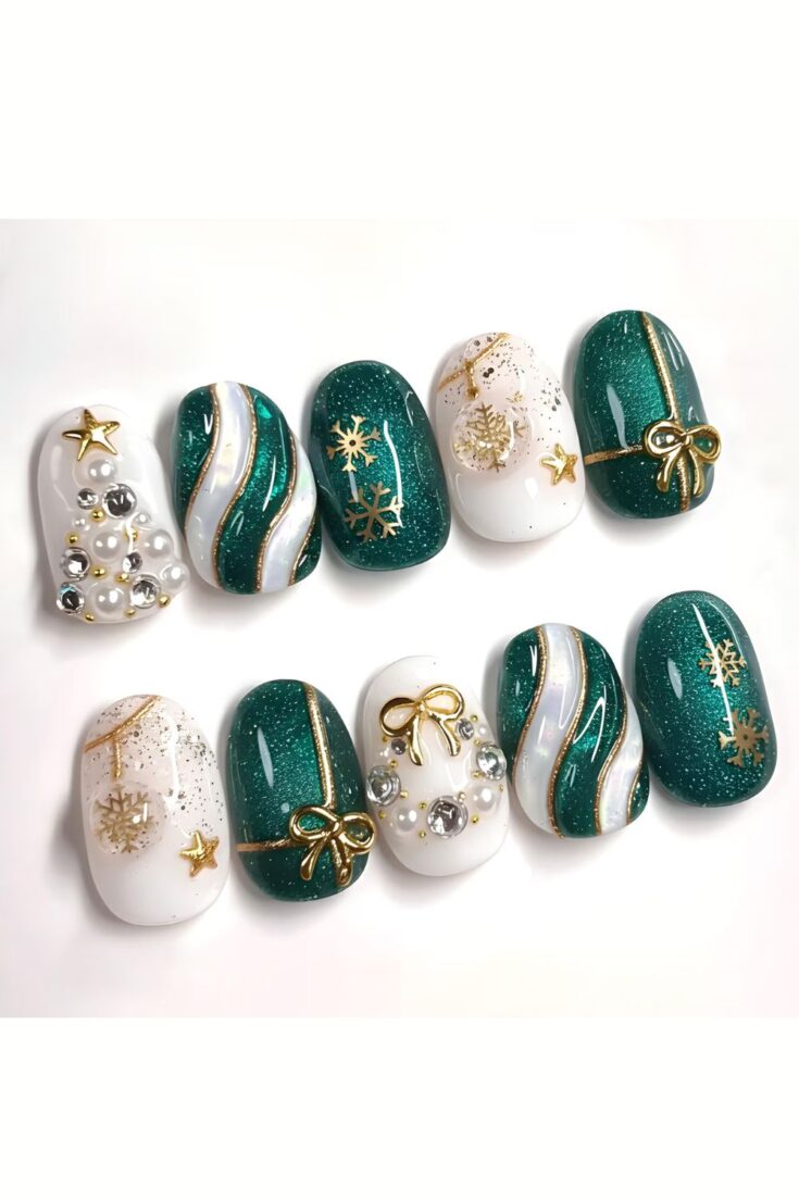 Green and white nails with gold bows, ornaments, pearls, and glitter. Elegant, festive, and perfect for a polished holiday look.