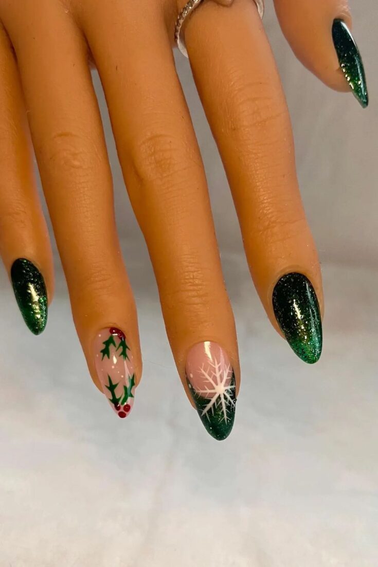 Dark green glitter nails with white snowflakes and holly accents. Simple, festive, and perfect for a classic Christmas look.