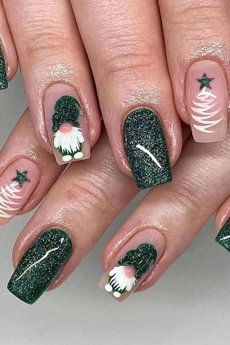 Dark green glitter nails with cute gonk designs and simple white Christmas trees. Fun, festive, and perfect for a playful holiday look.