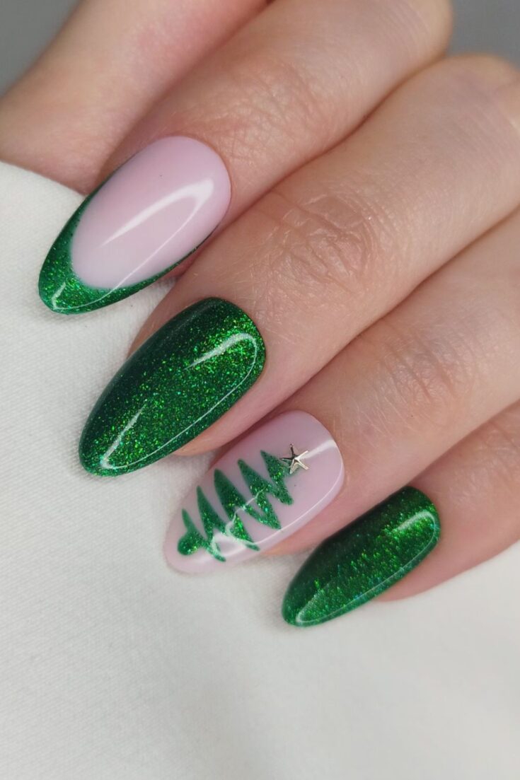Bright green glitter nails with a simple Christmas tree accent and a silver star. Clean, festive, and easy to wear.
