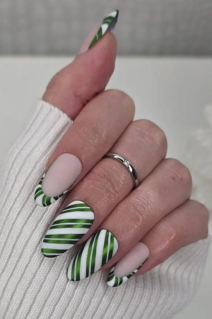 Matte nude nails paired with bold green and white candy-cane stripes. Simple, clean, and perfect for a festive winter look.