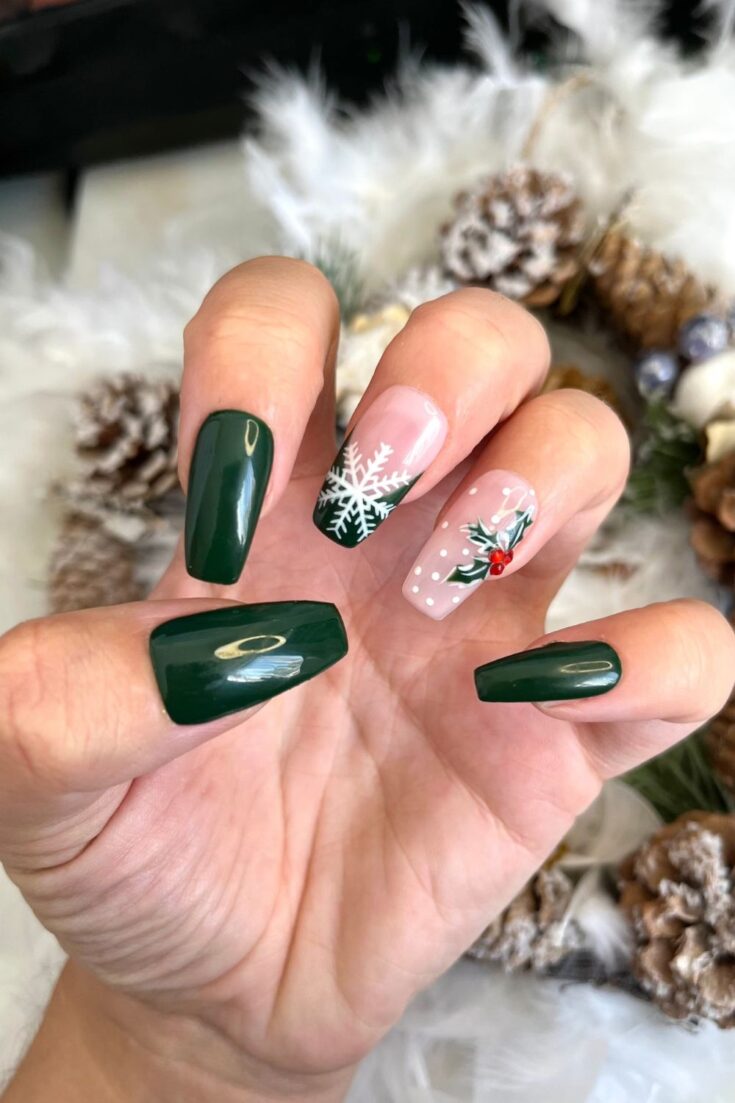 Glossy dark green nails paired with soft pink accents featuring a white snowflake and holly. Simple, cute, and festive.