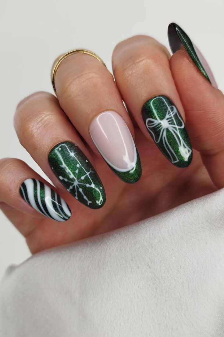Shimmery green nails with white bows, snowflakes, and striped accents. Cute, simple, and perfect for a festive winter look.