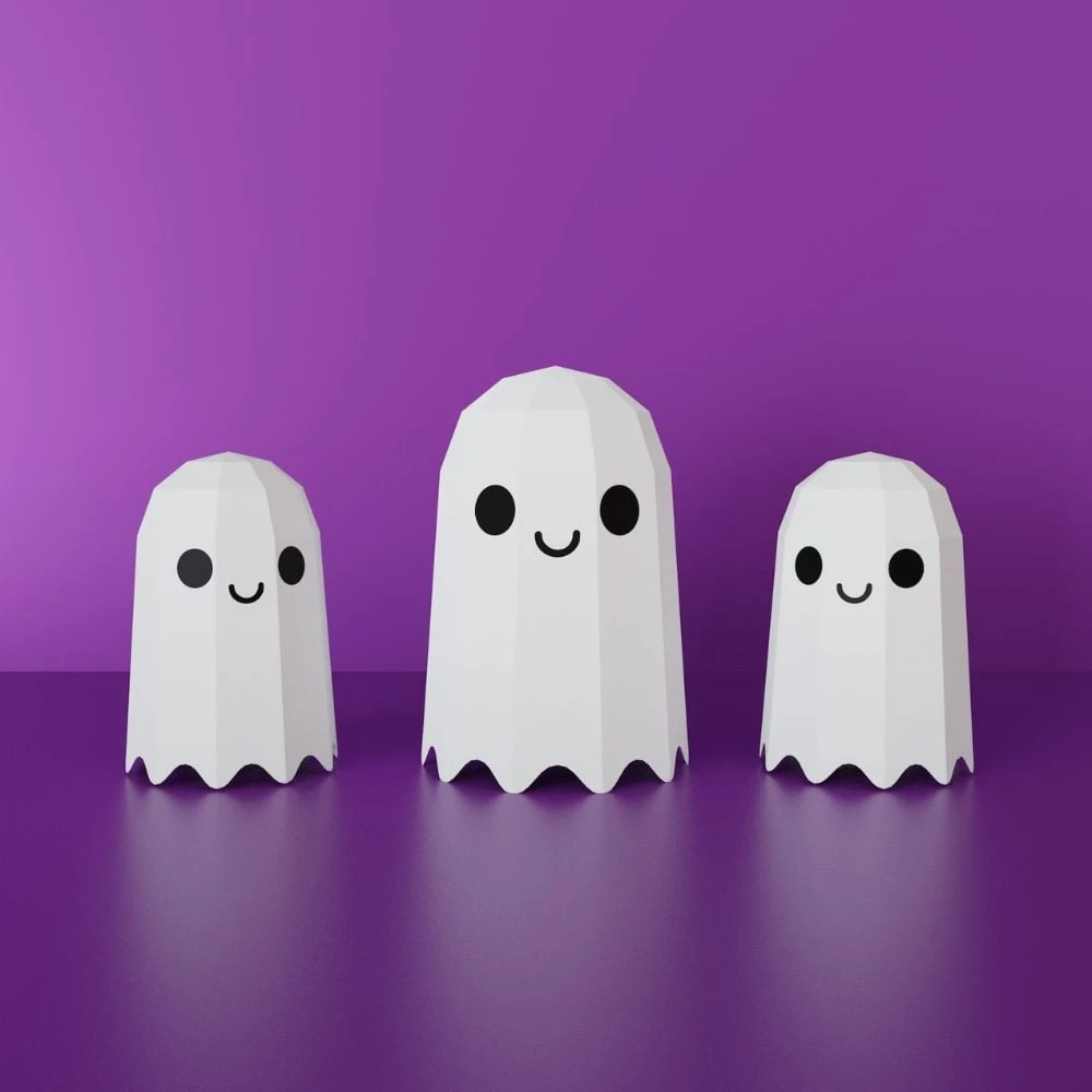 Print and build your own spooky ghost decoration with this easy papercraft project—just cut, fold, and glue.