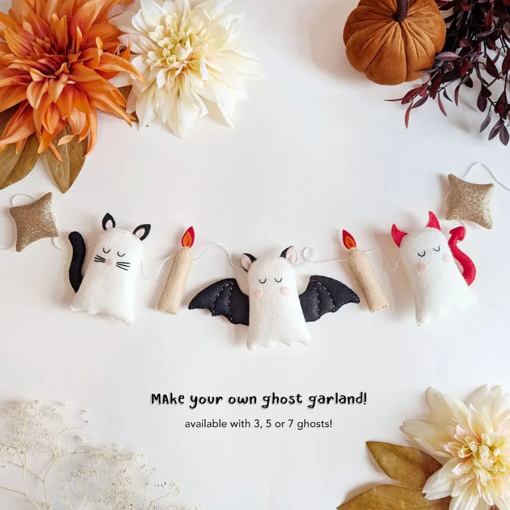 Sew your own adorable ghost garland with this beginner-friendly felt craft kit. Choose from 7 fun ghost characters like Dracula, Witch, and Pumpkin. Each kit includes everything you need—felt, thread, stuffing, needles, and instructions. A cute and cosy Halloween craft project for all ages.