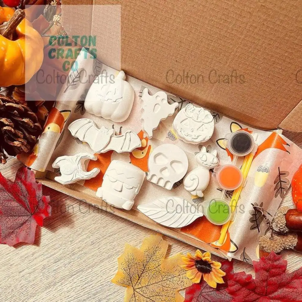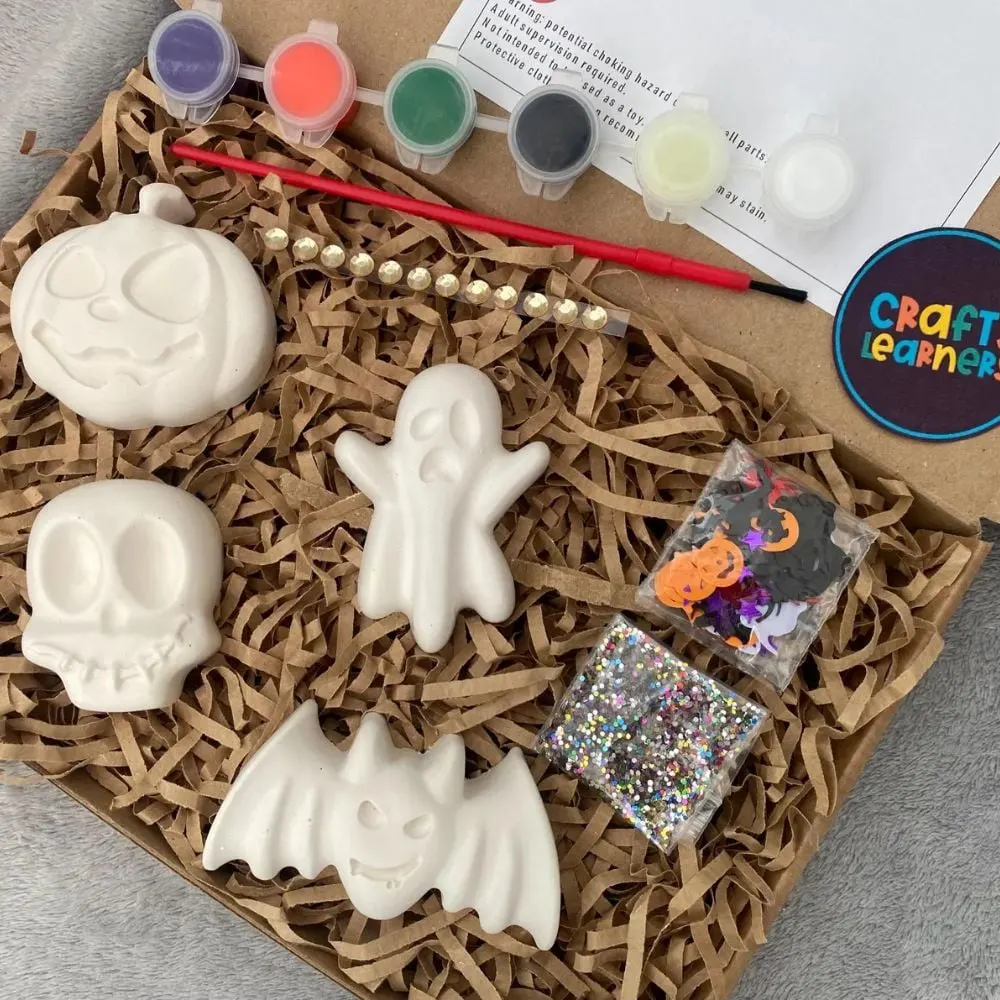 A fun painting set for kids and adults—includes spooky plaster shapes like bats, pumpkins, and ghosts.