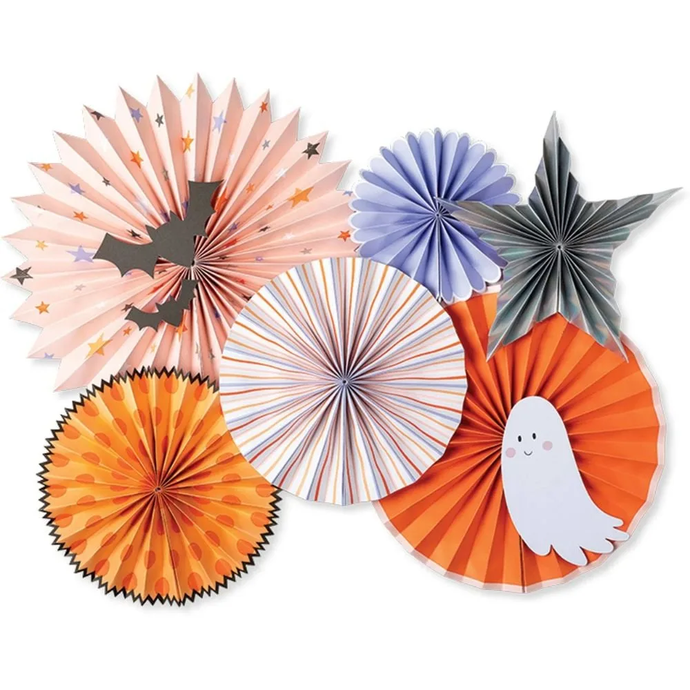 Add a pop of pastel to your party! This set of 6 hanging fans with bats, ghosts, and holographic sparkle is perfect for indoor or porch decor.