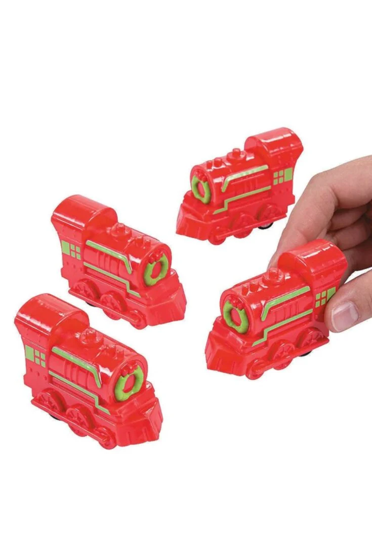 A festive mini train that zooms forward when pulled back—cute, nostalgic, and perfect for Christmas stockings.