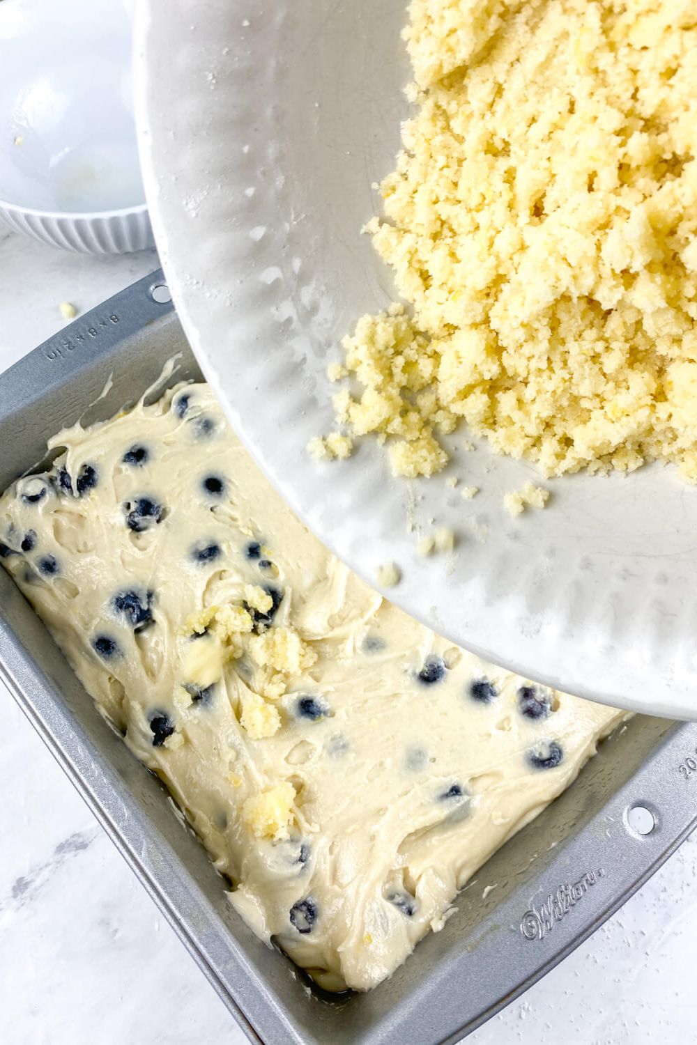 - Sprinkle the crumb topping evenly over the batter.