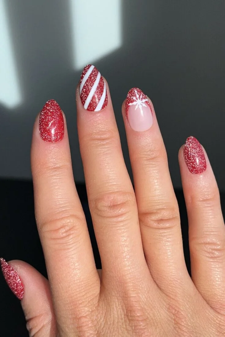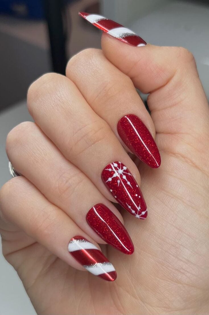 Red glitter nails with bold candy cane stripes and a crisp white snowflake. A bright, festive look for December.