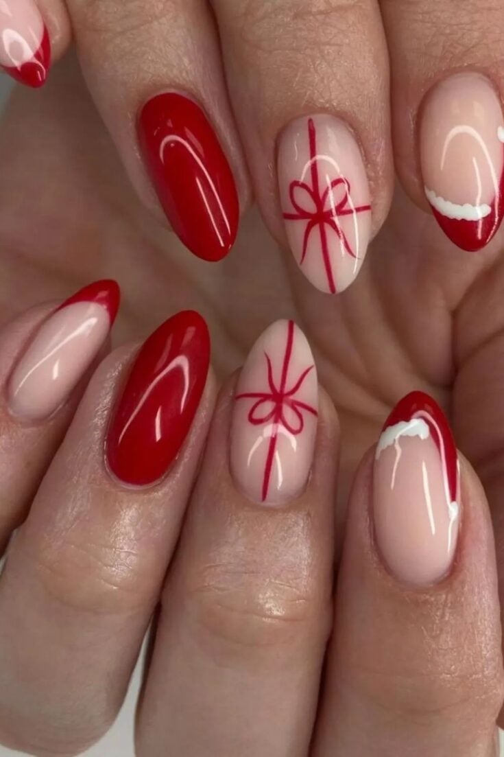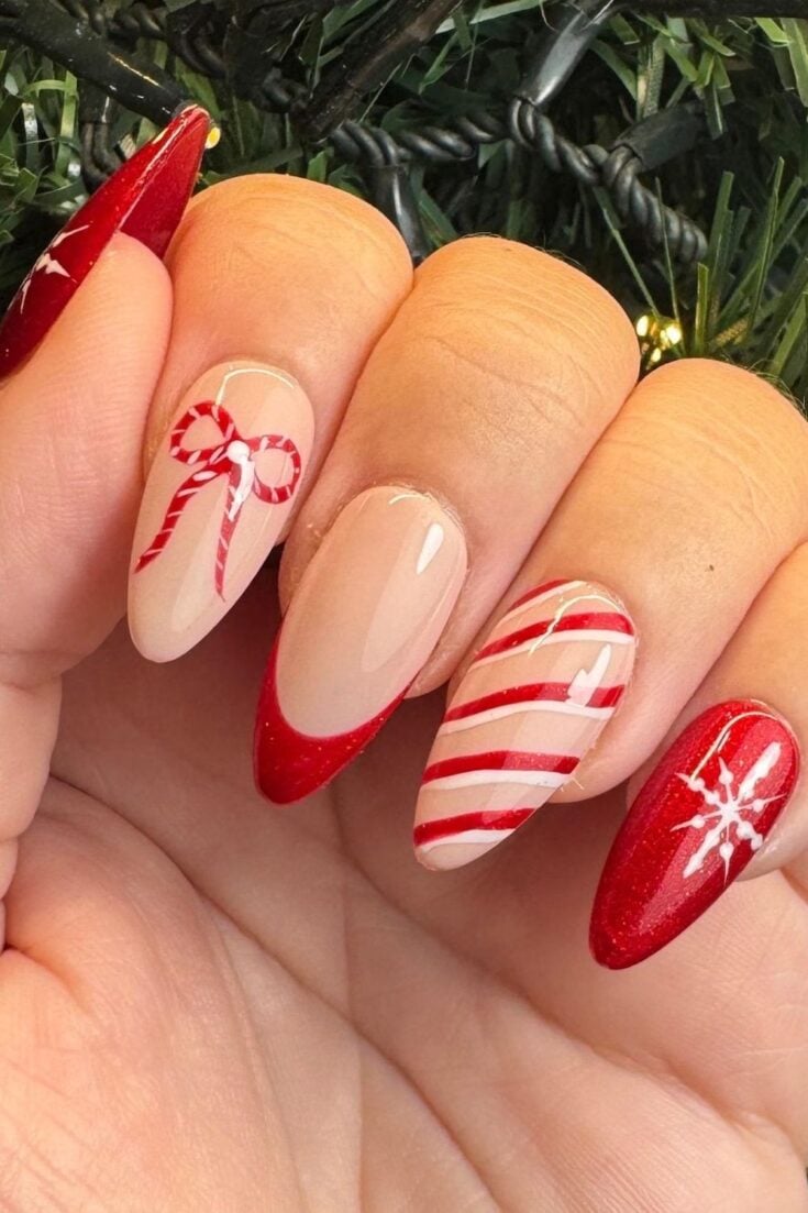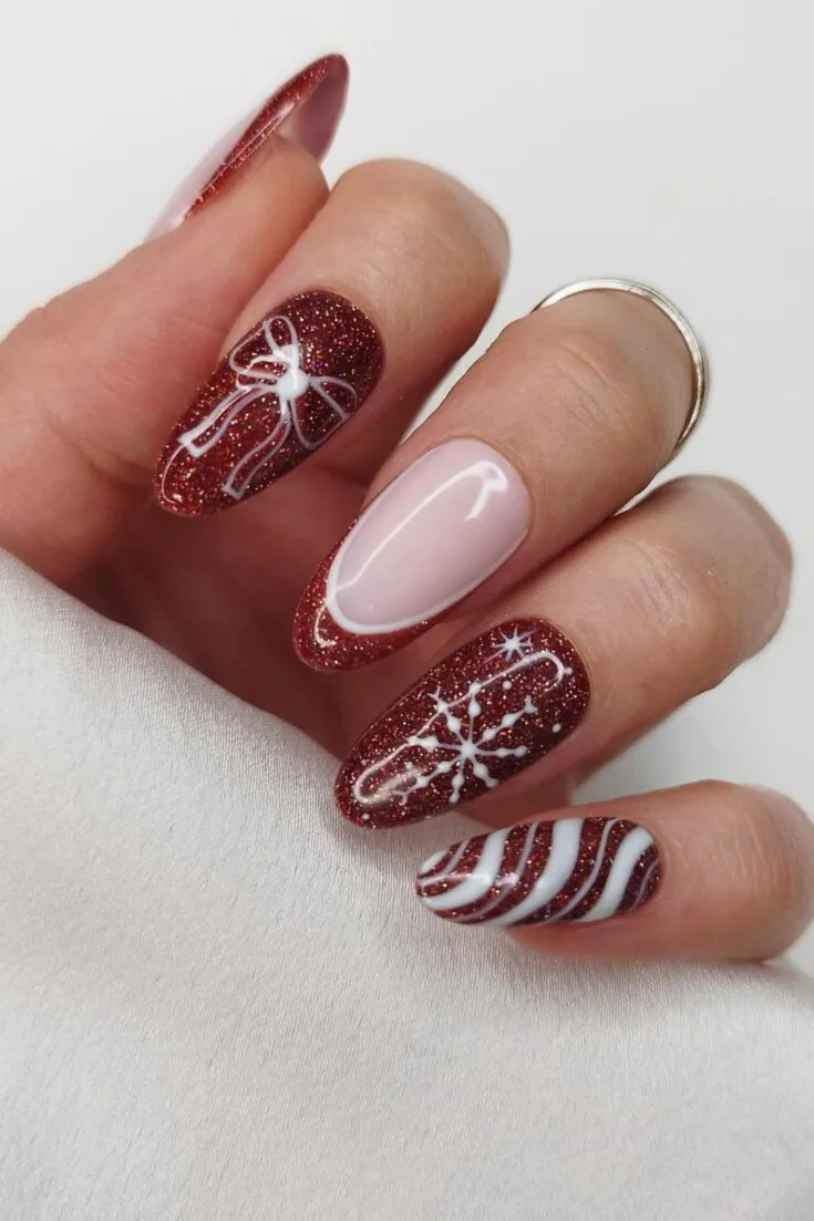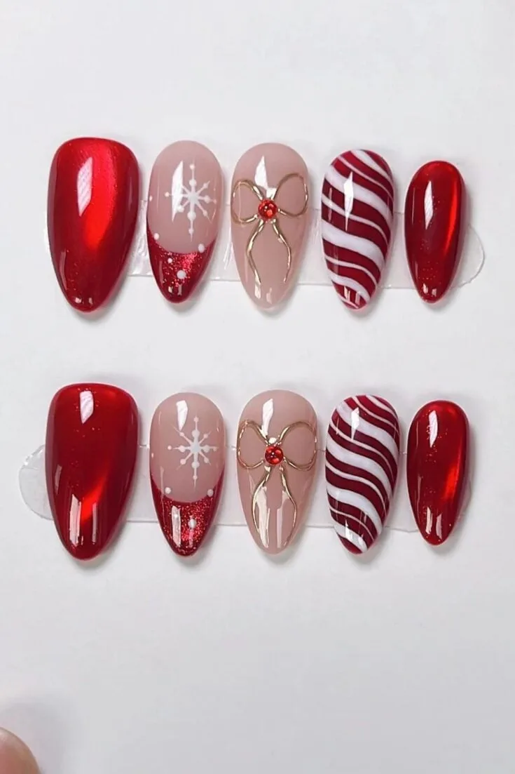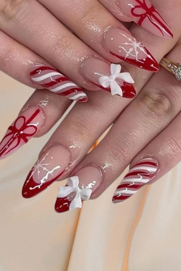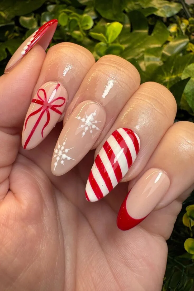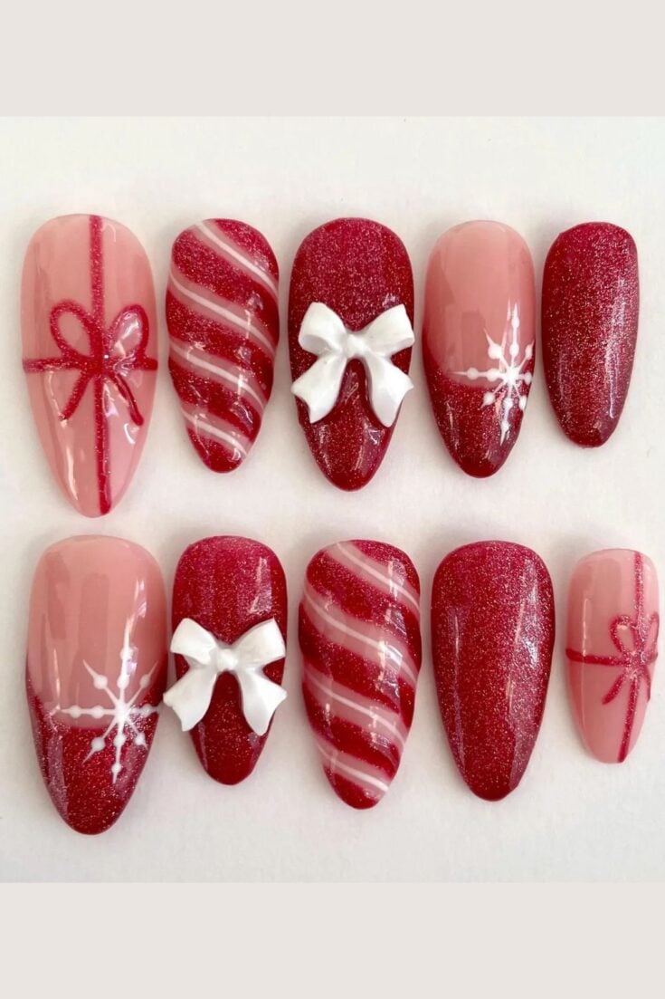 These nails mix red sparkle with bows, stripes, and soft nude tones. The candy-cane lines and small gift-wrap details give a cute Christmas look without feeling too busy.