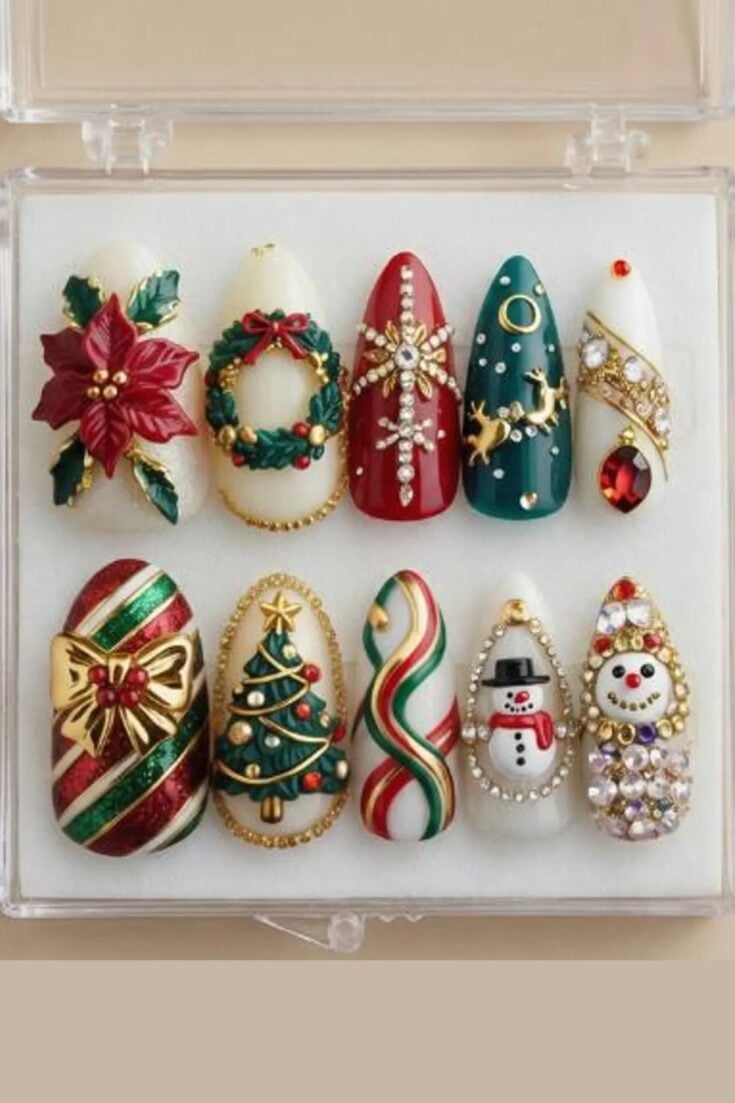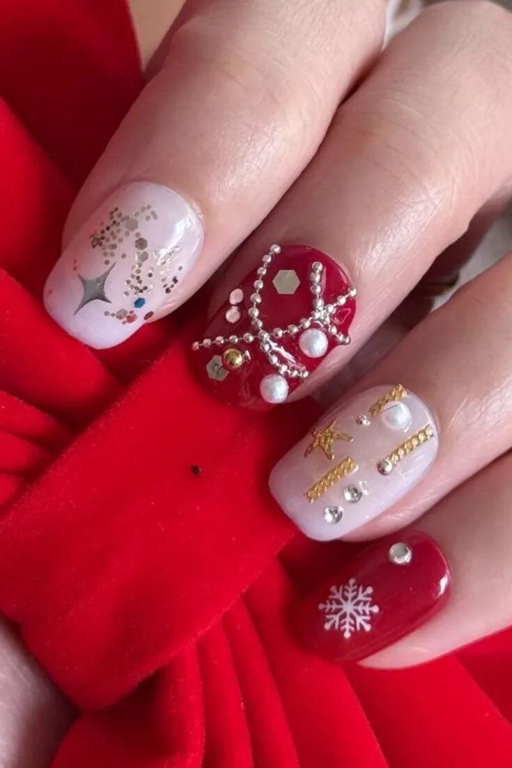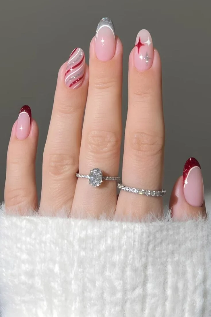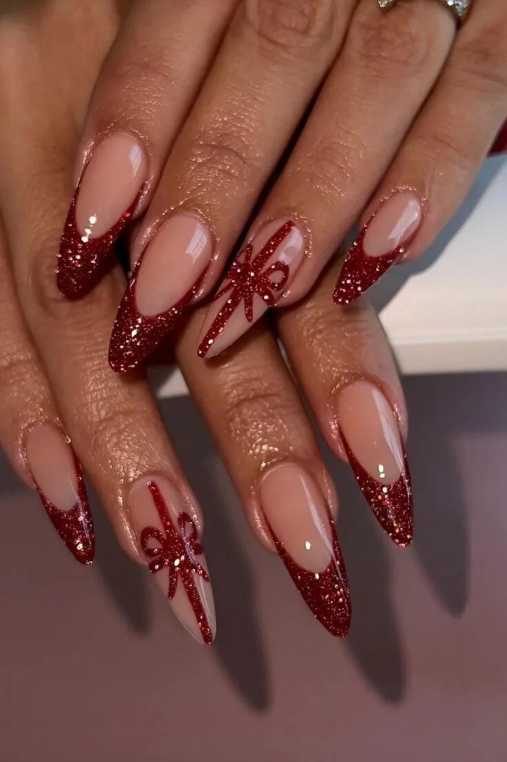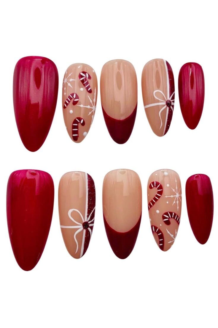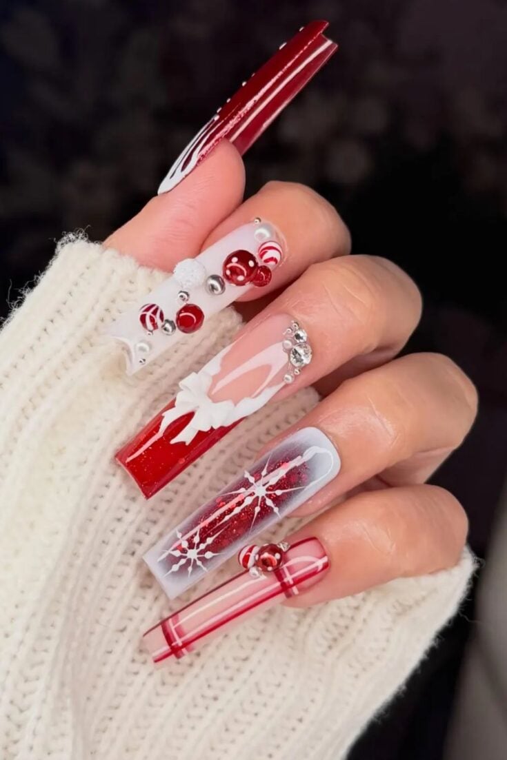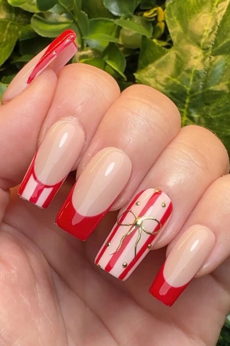 These nails mix red sparkle with bows, stripes, and soft nude tones. The candy-cane lines and small gift-wrap details give a cute Christmas look without feeling too busy.
