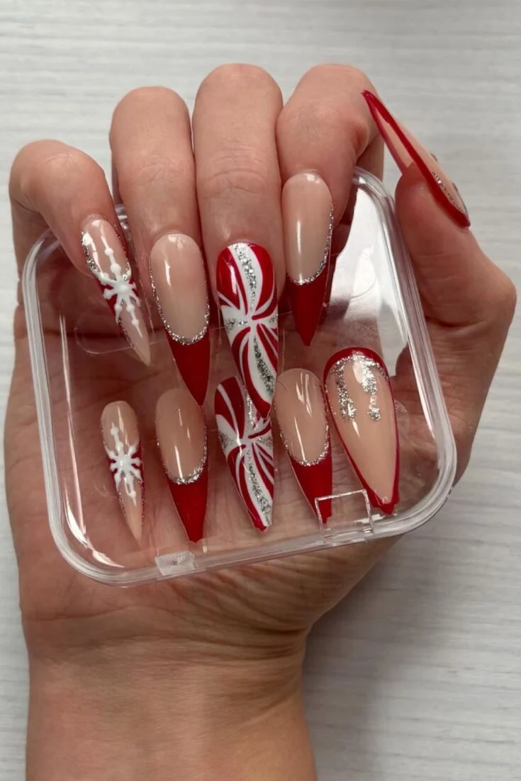 Red and nude nails with snowflakes, candy cane details, and glitter. A simple and festive Christmas look.