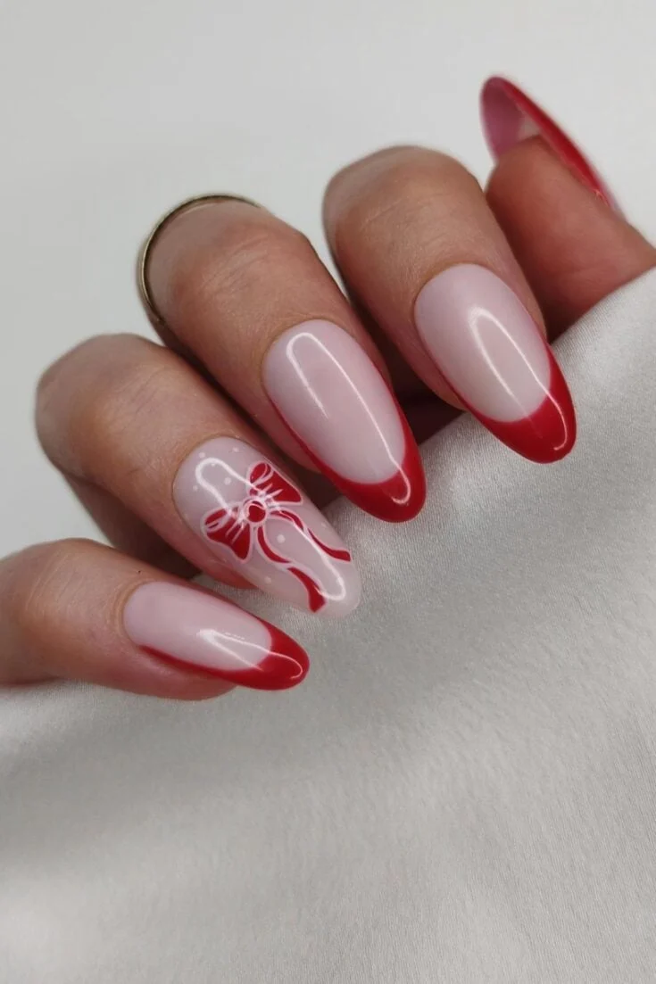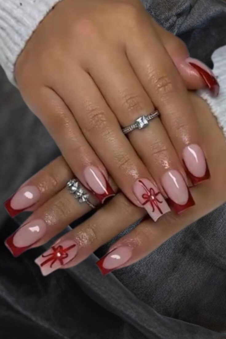Soft red French tips with tiny white bows. Cute, simple, and perfect for a sweet Christmas look.