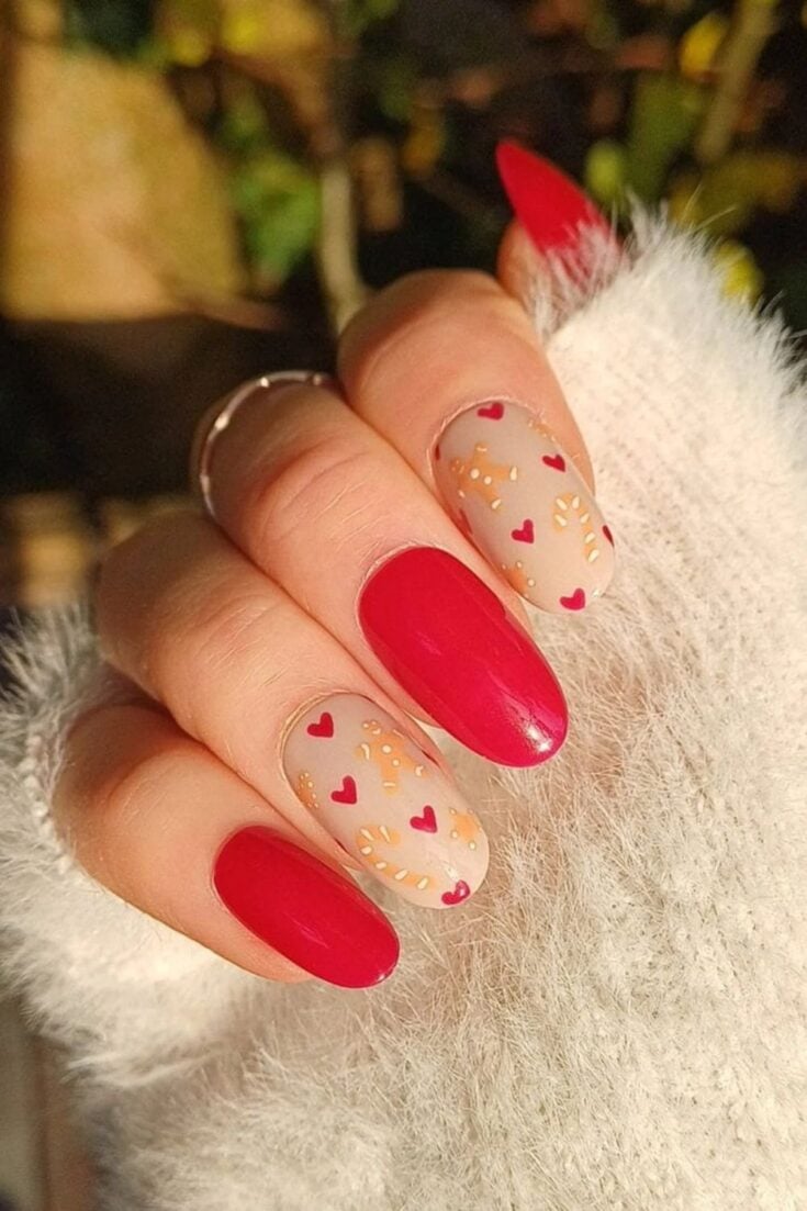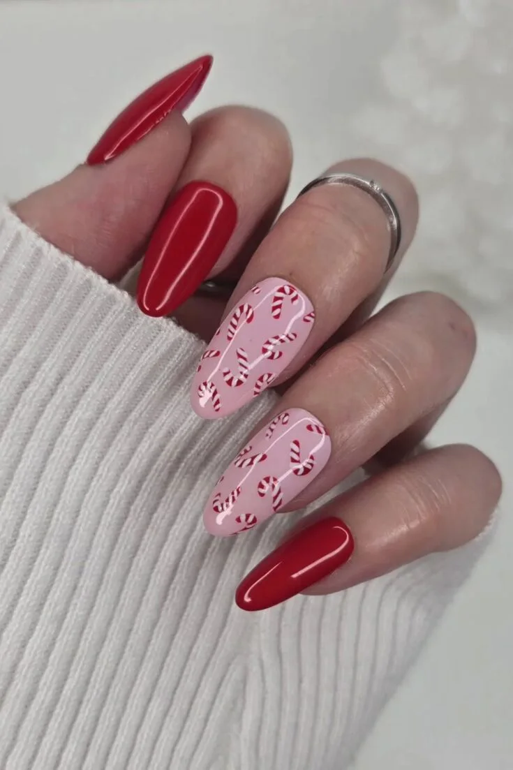 A sweet mix of bold red nails and cute candy-cane accents. The tiny hearts add a warm festive touch. Perfect for a soft, cheerful Christmas look.
