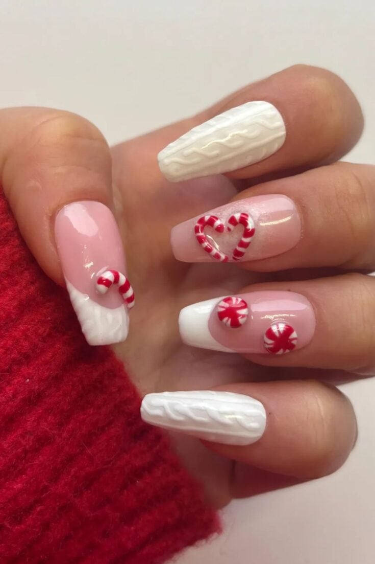 Red and white nails with 3D candy cane, sweater texture, and sparkle. Cosy, fun, and perfect for winter.