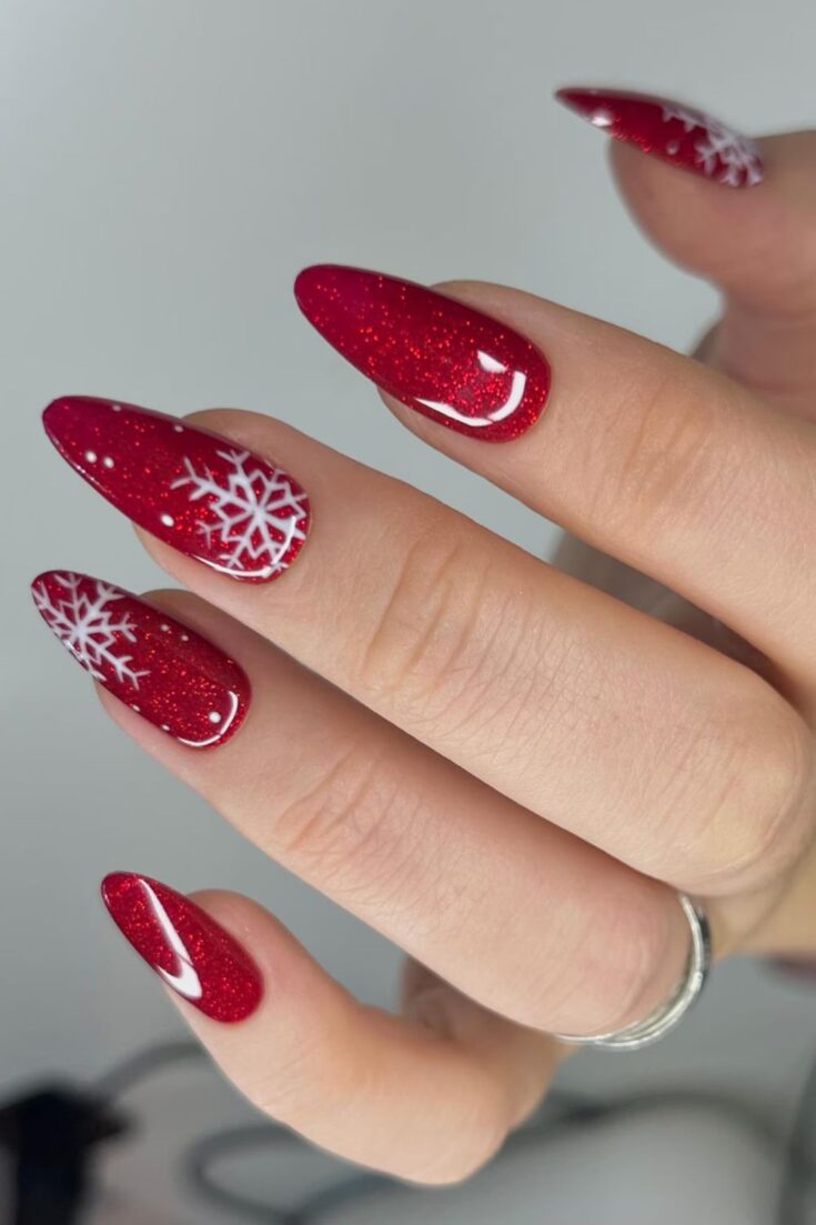 Red glitter nails with crisp white snowflakes. A bright, classic winter design.