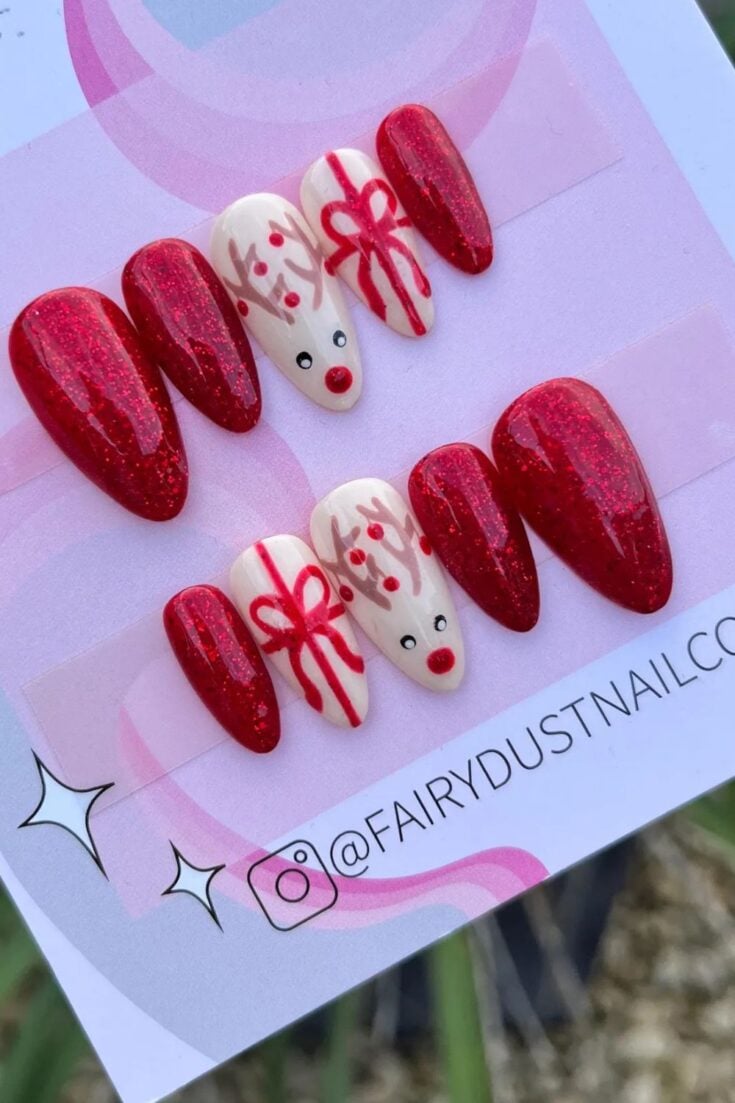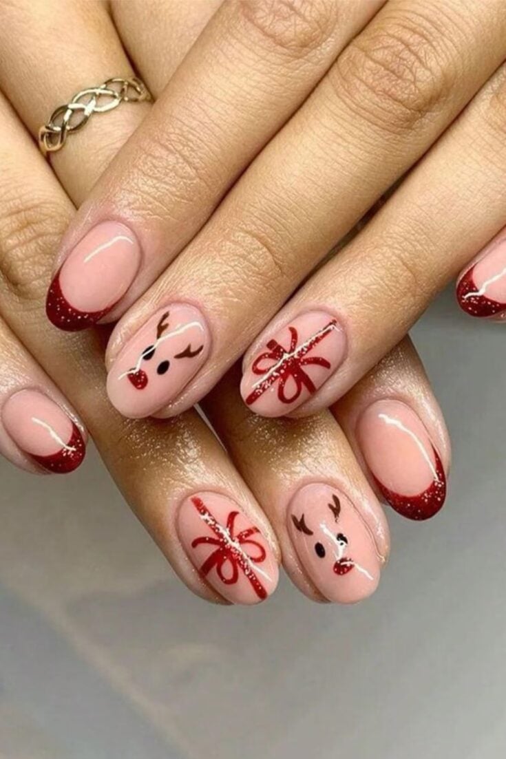 Soft red glitter French tips with cute reindeer faces and tiny gift-wrap bows. A sweet, playful Christmas look.