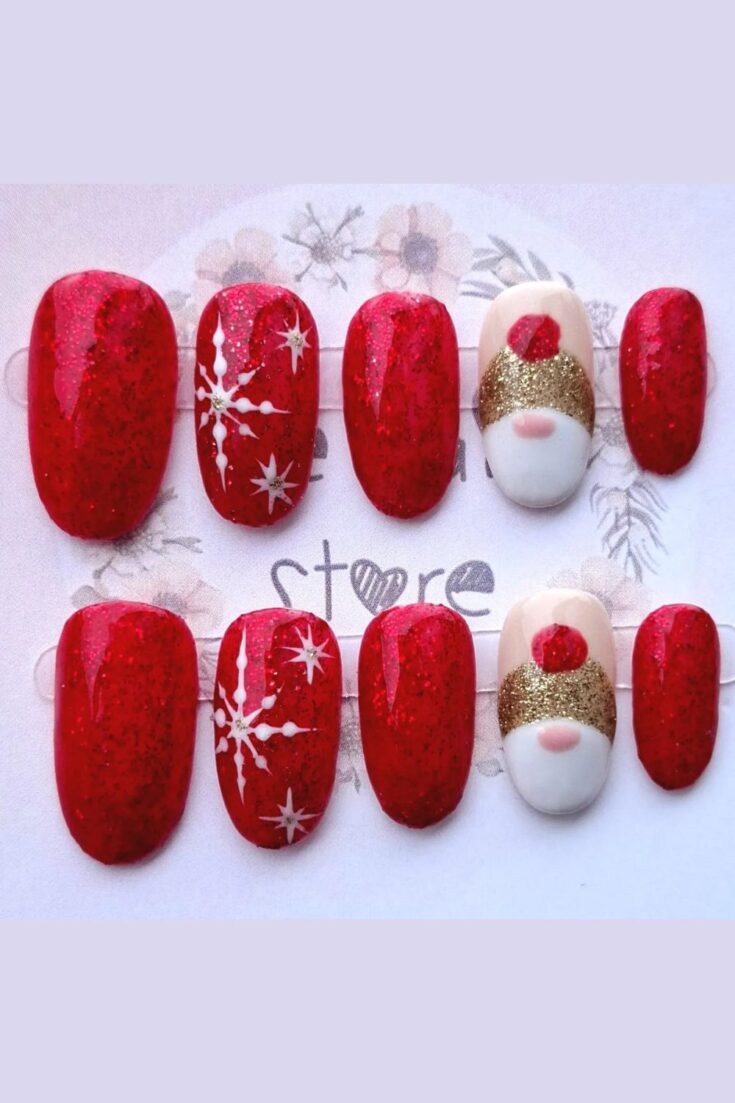 Red glitter nails with a cute hand-painted gonk. A fun and cosy Christmas design.