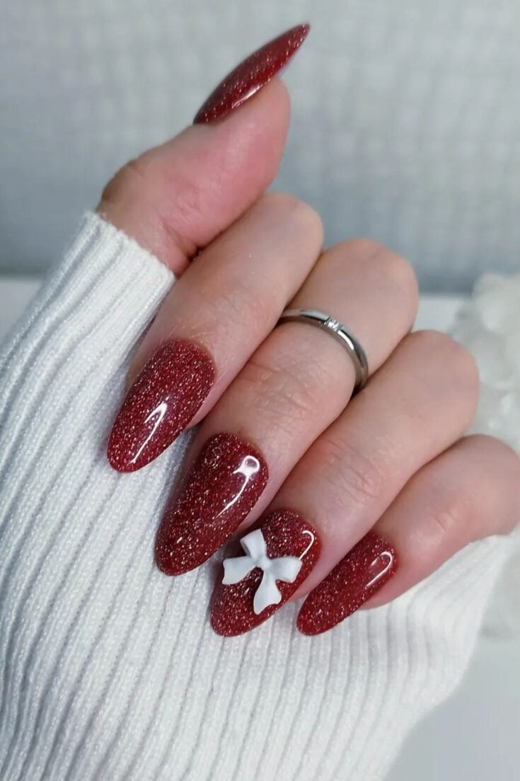I love red Christmas nails because they always feel festive and bold. They make every outfit look polished, and they work for any winter event. This list has simple designs, dark reds, sparkly ideas, cherry shades, cute bows, and white details!