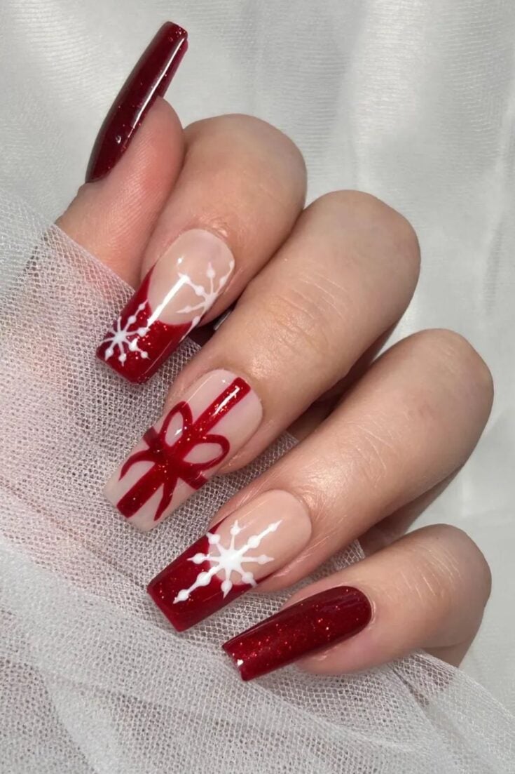 These long red nails mix bold glitter with soft nude tips and bright white snowflakes. The bow accent adds a cute gift-wrap touch for Christmas.