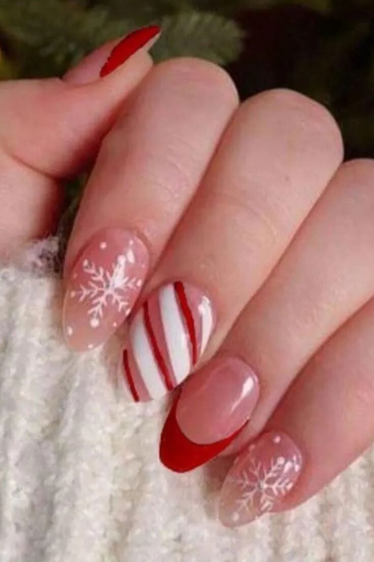 Candy Cane Snowflake Almond Nails