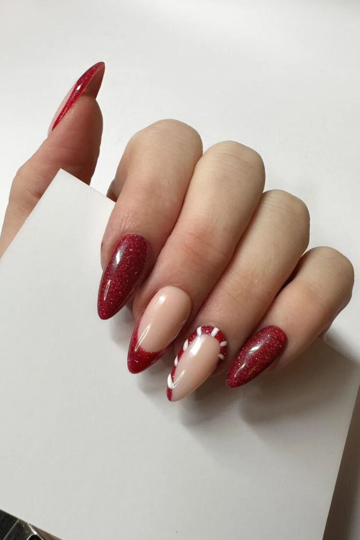 Soft nude nails with red glitter french tips and a cute candy cane accent. A simple, festive look that feels sweet and classic.
