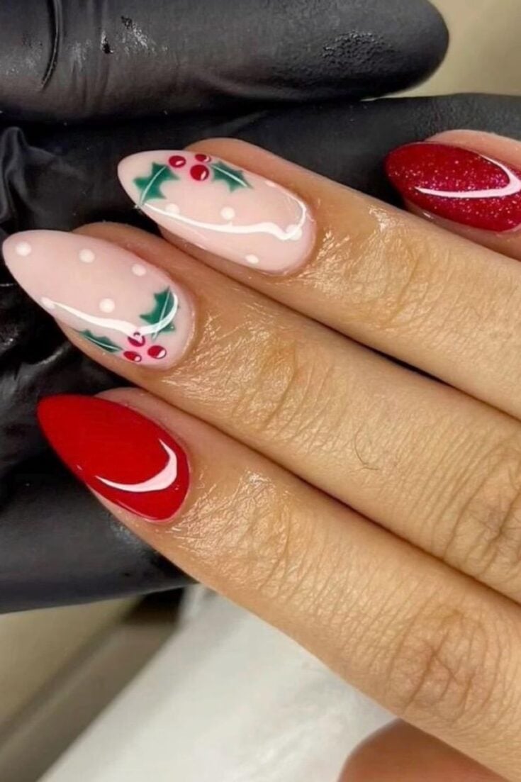 Soft nude nails with holly berries, white dots, and bold red accents. A cute, classic design for a festive winter look.
