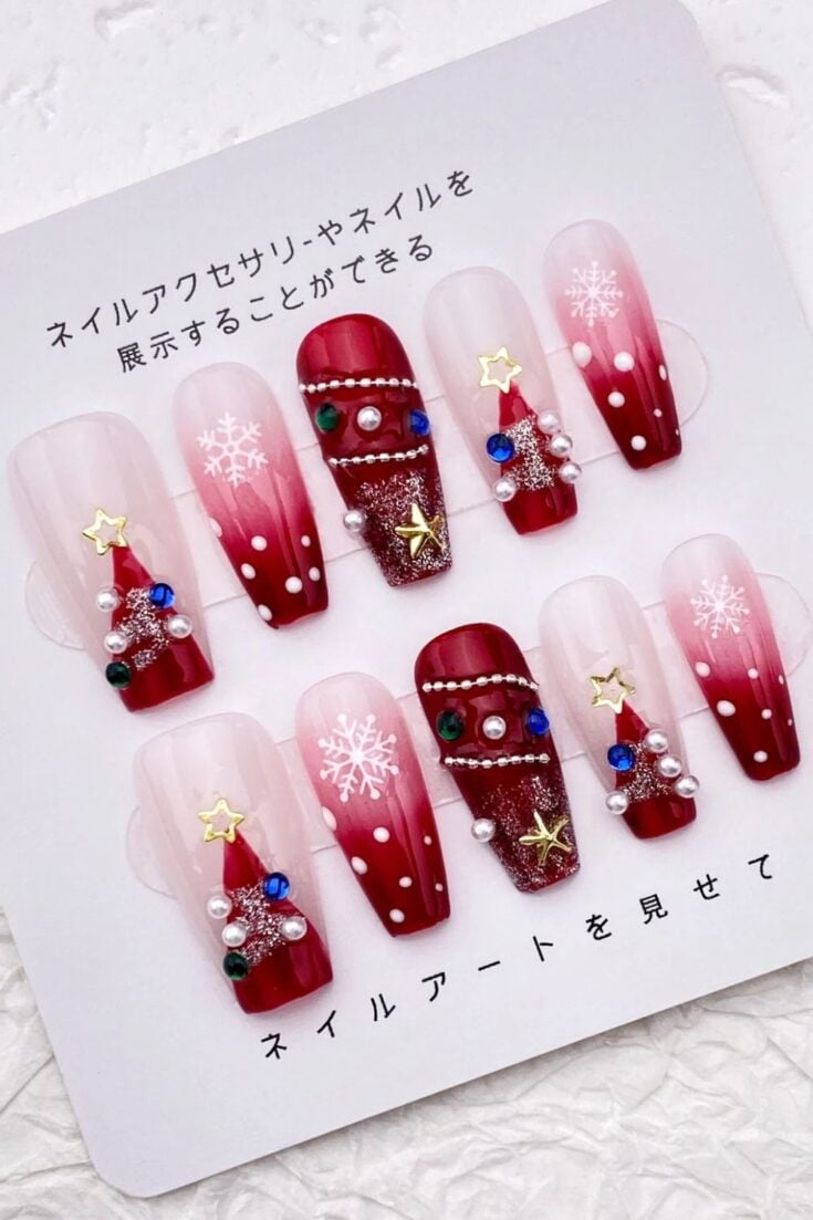 Soft red ombré nails with snowflakes, tiny pearls, and gem-studded Christmas trees. A bright, playful holiday look.