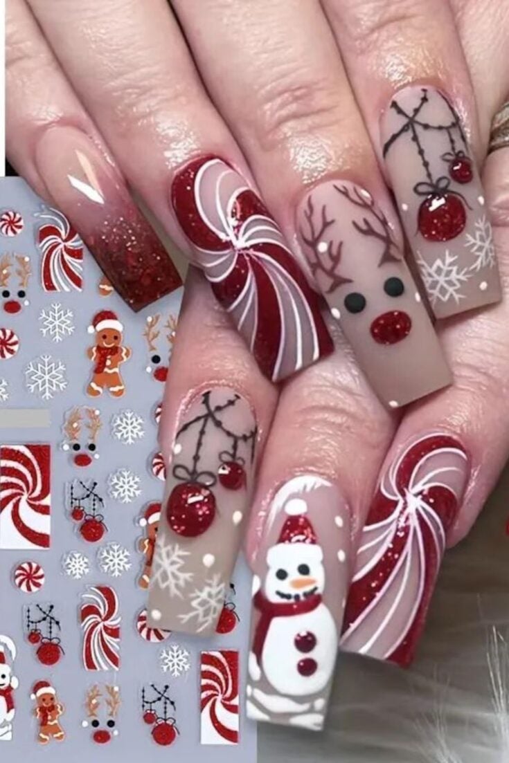 Cute festive nails with bold red details, candy-cane swirls, snowflakes, and a sweet snowman accent. Fun and Christmassy.